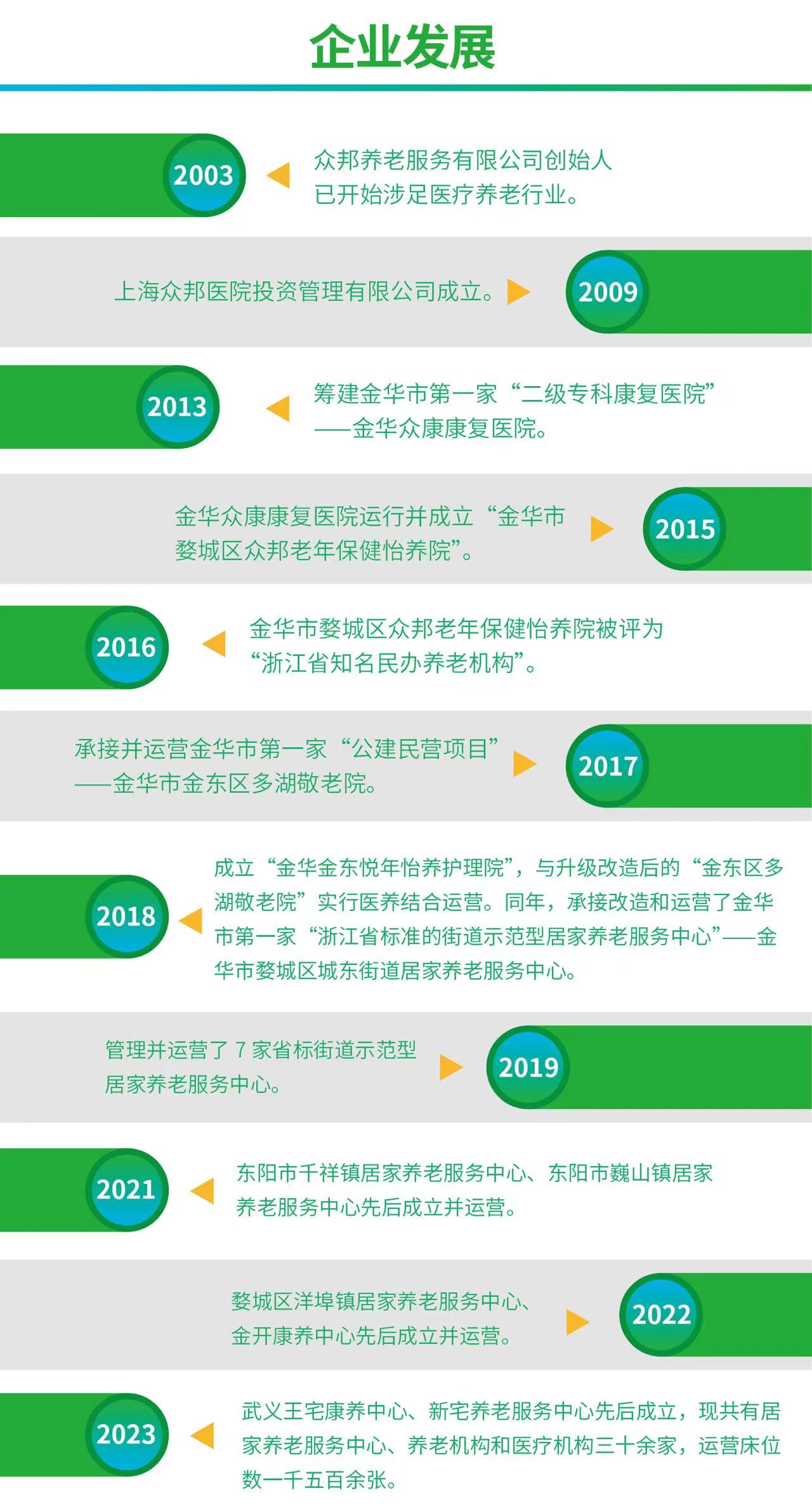 众邦养老服务有限公司按照“立足金华、布局浙江、辐射长三角”的连锁战略模式,以“为每一位长者提供有尊严、有安全、有质量的养老生活”为使命,并践行“以服务赢口碑、做有温度的养老”这一服务宗旨,在传统养老的基础上,自主创新,勇于进取,成立居家养老服务中心、养老机构和医疗机构三十余家,运营床位数一千多张,并在内部设立智慧养老平台,利用可穿戴智能设备、微信小程序等多种方式为社区和机构老人提供便捷服务,实现了社会效益和经济效益的共同发展,为探索为老服务的公益性和商业性共同发展做出了贡献。